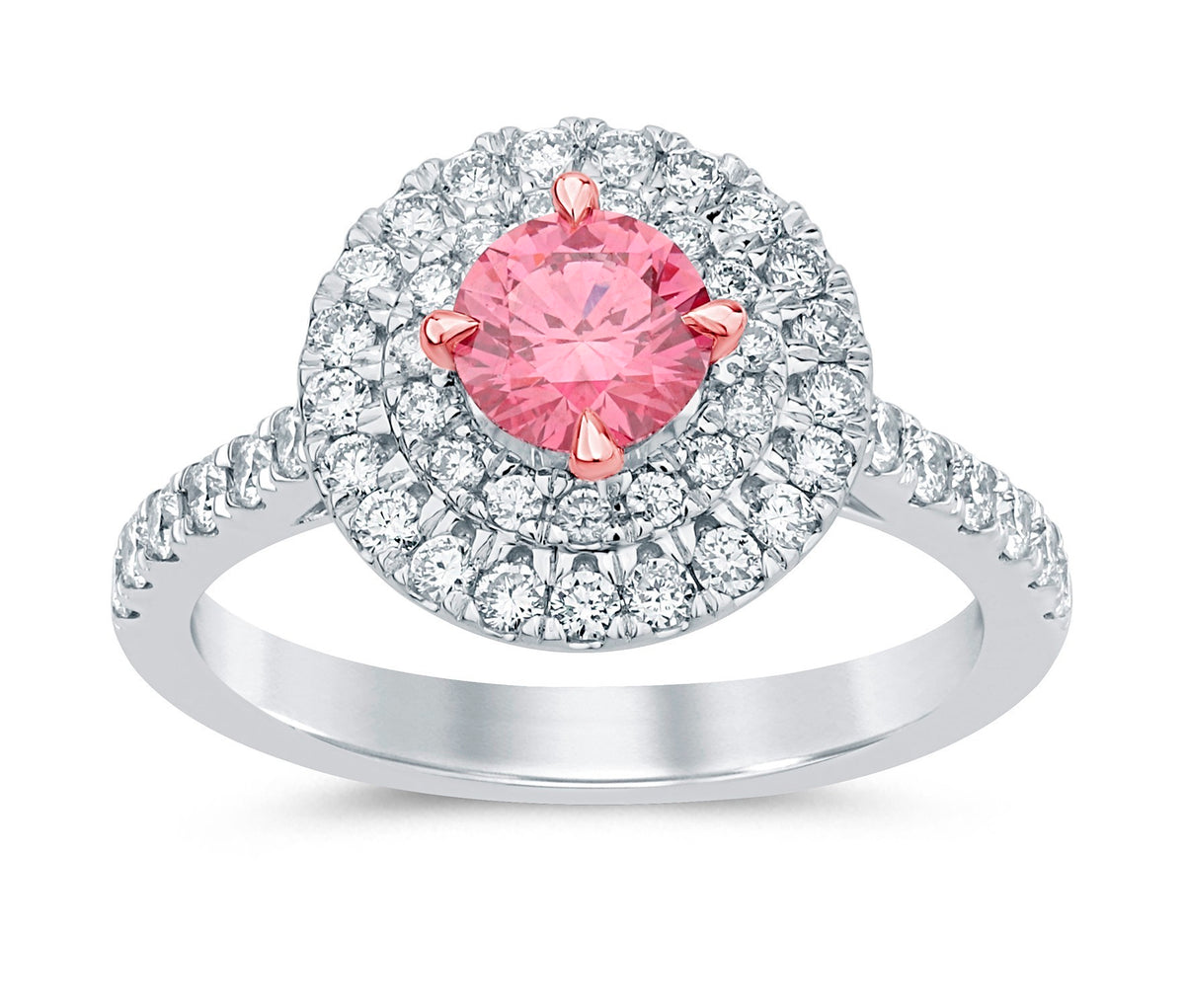 Round pink lab grown diamond wrapped with white lab grown diamonds with a halo with band diamonds setting.