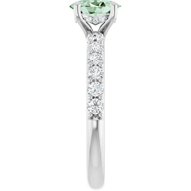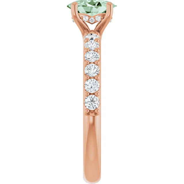 Oval green lab-grown diamond ring with a hidden halo of white diamonds. Elegant, modern design in 14k gold—timeless sparkle with a rare twist. Certified.