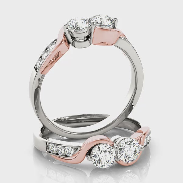 Simply unique twisted two stone rings design blending rose and white gold bands.People have a double take at this stunning piece with twice the bling.