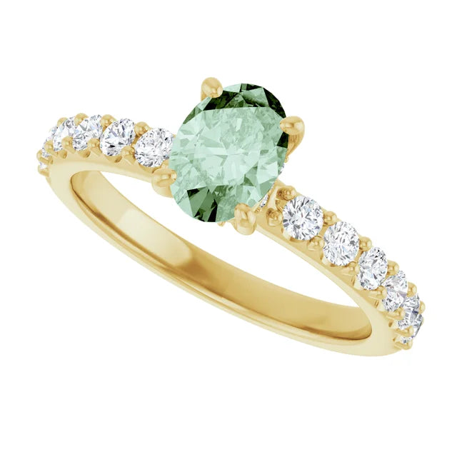 Oval green lab-grown diamond ring with a hidden halo of white diamonds. Elegant, modern design in 14k gold—timeless sparkle with a rare twist. Certified.