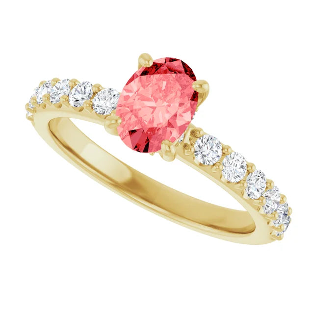 Oval pink lab-grown diamond ring with hidden halo of white diamonds. Romantic 14k gold design—vivid sparkle and timeless elegance. Certified.